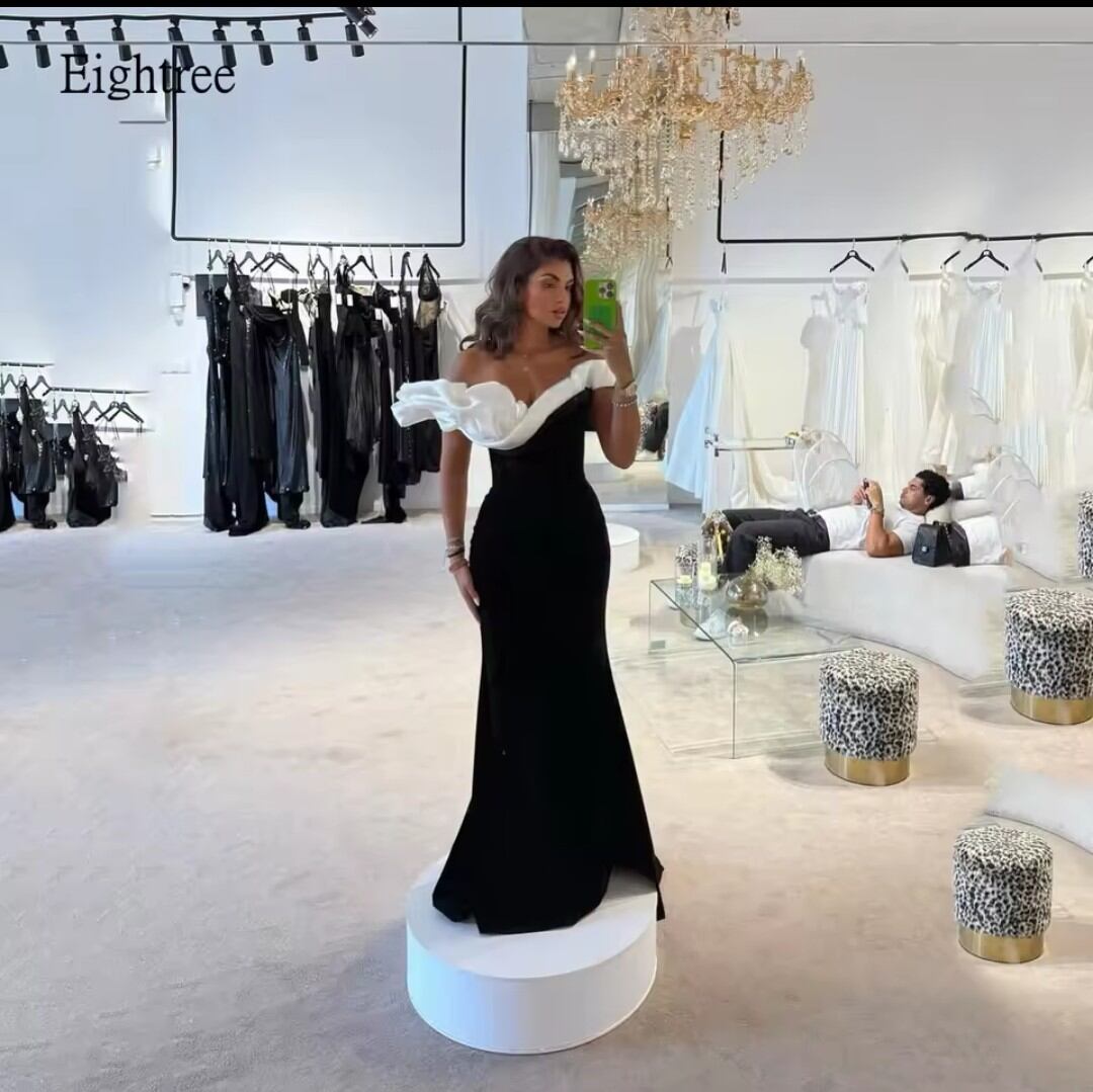 《オーダーメイド》シックなブラック/ホワイトオフショルダーマーメイドウエディングドレス背中の開いたイブニングドレスフロアレングスパーティードレスカスタマイズ