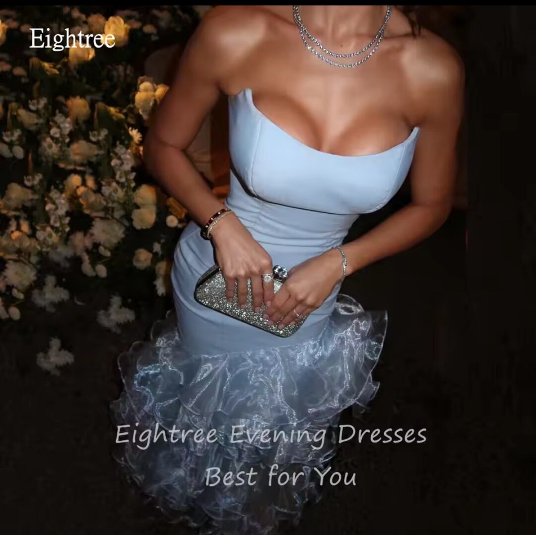 《オーダーメイド》エレガントなスカイブルーストラップレスマーメイド プロムドレス ノースリーブ ティアードフォーマルパーティードレス フロアレングスイブニングドレス カスタマイズ